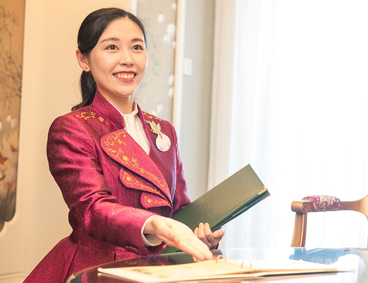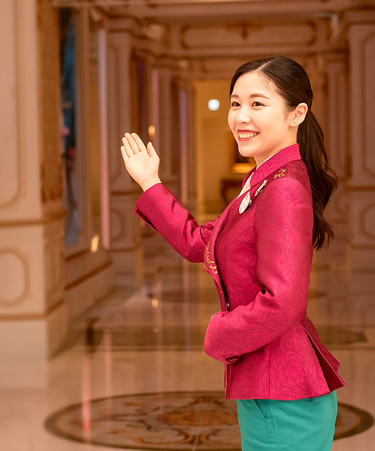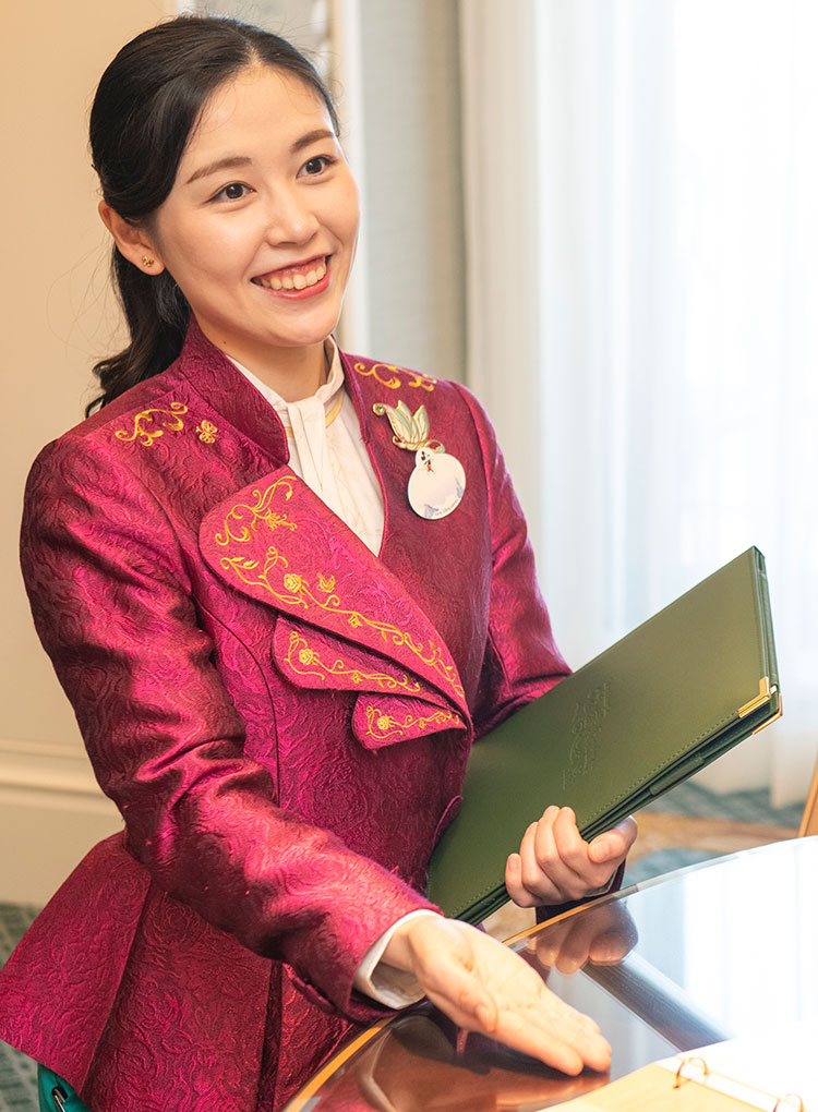 私は時間帯責任者として円滑にオペレーションが遂行できるよう、広い視野で状況を把握し、コントロールを行っています。特別な想いでお越しいただく一組一組のゲストに寄り添って、ベストな選択を瞬時に判断し、各部署と連携を取りながら、日々の業務に務めています。