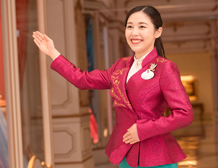 『東京ディズニーリゾートで叶える最上級のリゾートステイ』というミッションの元、グランドシャトーにご宿泊されるゲストのトータルケアを行うことが私たちの仕事です。チェックイン・チェックアウトやパークチケット販売などのフロント業務、客室へのご案内、荷物預かり等のベルサービス業務、客室からの電話対応業務、ウェルカムドリンクやインルームダイニングのデリバリー、サプライズのお手伝いなど、その内容は多岐にわたります。
